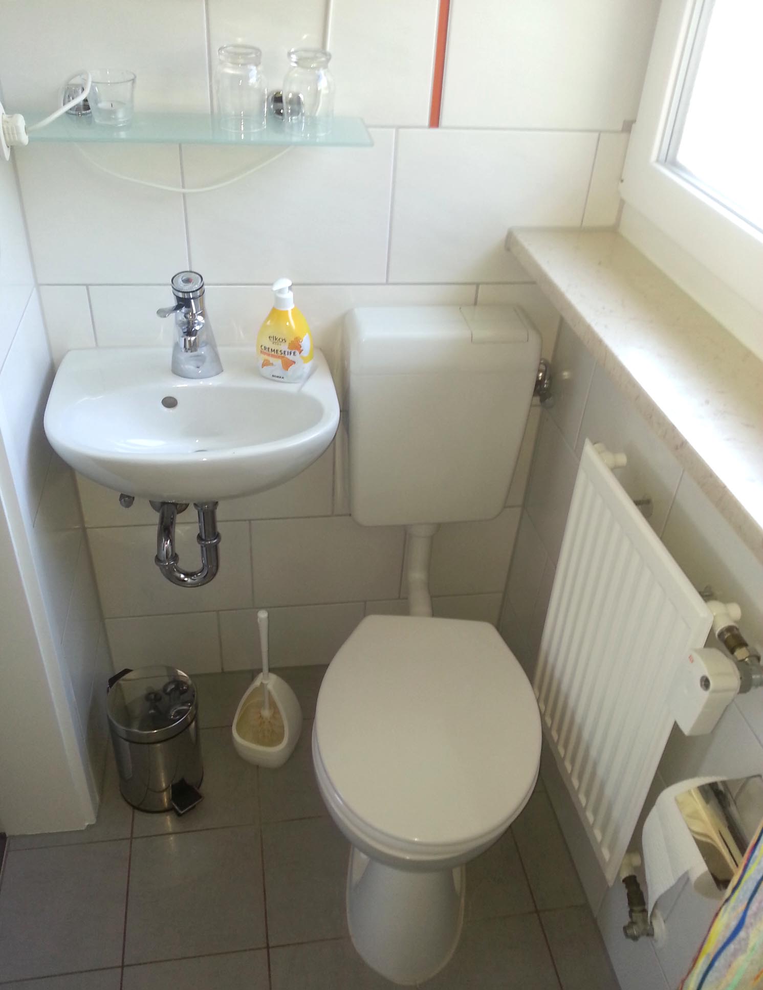 The small, heatable guest bathroom has washbasin, toilet and shower. Towels and shower gel are available.